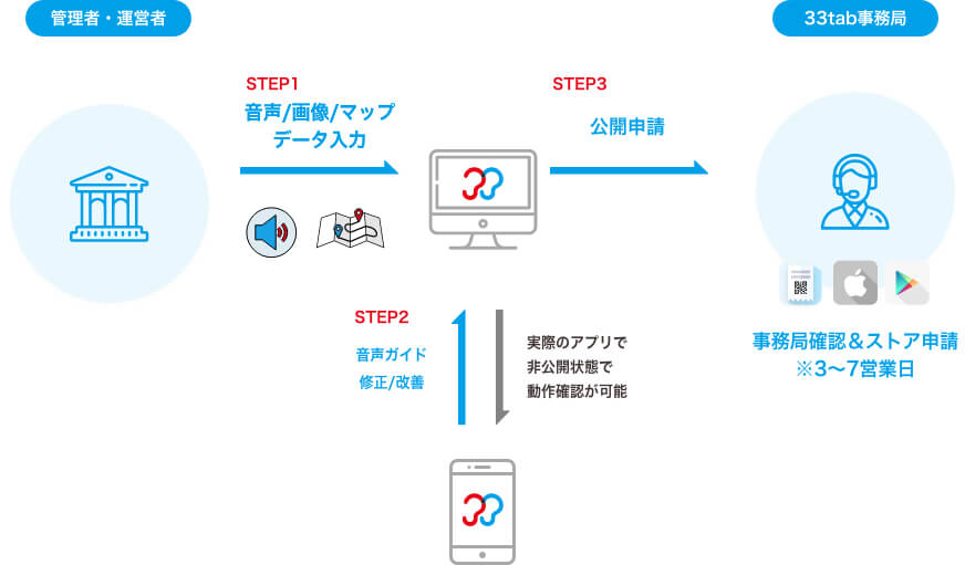 管理画面が提供されるまでの登録の流れと、音声ガイドを登録してから公開されるまでの流れをご紹介